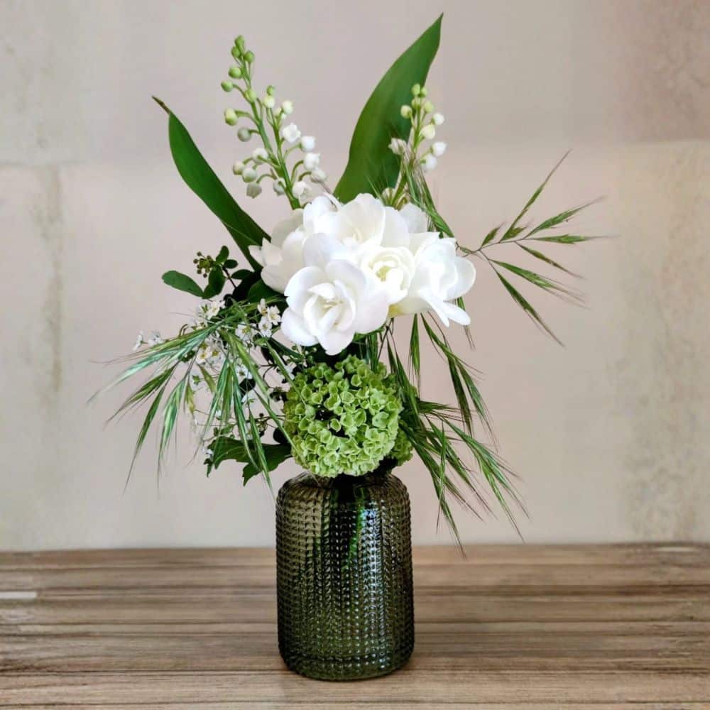Ajoutez un peu d’eau fraîche tous les deux jours au centre du vase. Le muguet et le freesia aiment la fraîcheur : n’hésitez pas à placer le vase dans une pièce fraîche la nuit.