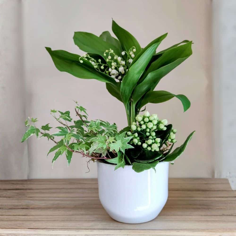 Cette composition fraîche et raffinée réunit le muguet porte-bonheur, un lierre panaché aérien et un Kalanchoé graphique, présentés dans un cache-pot en céramique blanc mat.